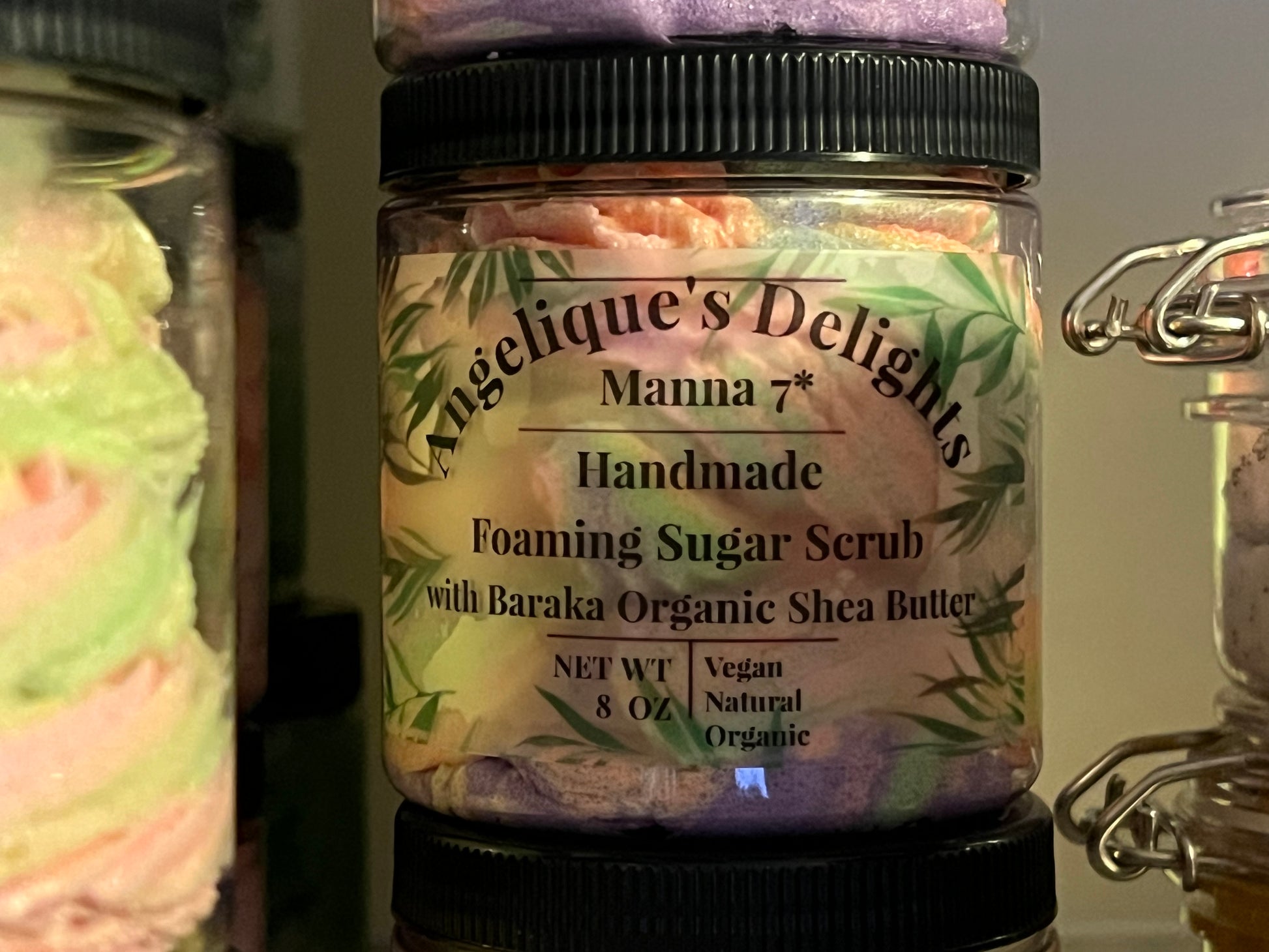 Handmade, All-Natural and Organic Foaming Sugar Scrub made with imported Baraka Organic Shea Butter, Organic Jojoba Oil, Organic Pure Cane Sugar, Fragrance, Mica, and my proprietary blend Premium Foaming Bath Whip.